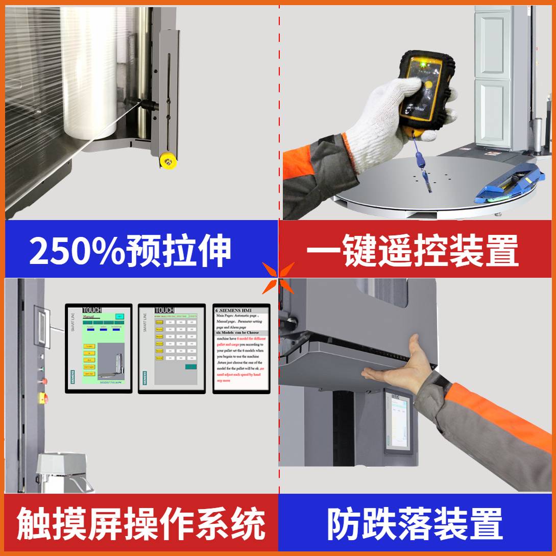 小黃蜂全自動(dòng)智能纏繞膜機(jī)X100,采用全自動(dòng)上斷膜裝置,搭配遙控裝置,操作員在將托盤(pán)貨物放置在圓