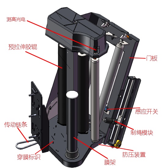 首先,膜座由膜架、導向輥柱、預拉伸膠輥、測高光電、傳動鏈條、制繩模塊以及防壓裝置等部分組成。在我們使用時,先打開門板將專用的機用膜放在膜架上,將薄膜按指定路線繞膜,然后將膜座門體輕推閉合即可,薄膜更換操作便捷。導向輥柱隨薄膜拉膜方向貼俯在預拉伸膠輥上,對薄膜按一定比例進行拉伸,壓力感應輥筒隨纏繞膜壓合在壓力傳感器上,壓力值的變化直接驅動膜座電機的放膜速度,從而改善產品四周纏繞膜的收縮力,最終提高打包纏繞的品質和效率。在運行時,測高光電將自動感應貨物高度,當纏繞至貨物頂部時,發(fā)送信號給到PLC,然后膜座停止上升。